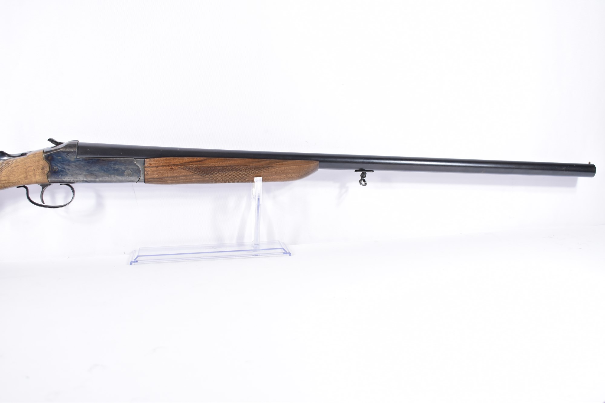 Die AYA Einzellader Flinte im Kaliber 12/70 hat eine Gesamtlänge von 119 cm, eine Lauflänge von 77 cm und eine Schaftlänge von 38 cm. Das Gewicht beträgt 2,85 kg. Der Zustand ist 3-4, was starke Dellen oder Kratzer an der Brünierung bedeutet. Der Schaft ist aus Holz und die Waffe verfügt über eine Handspannung.