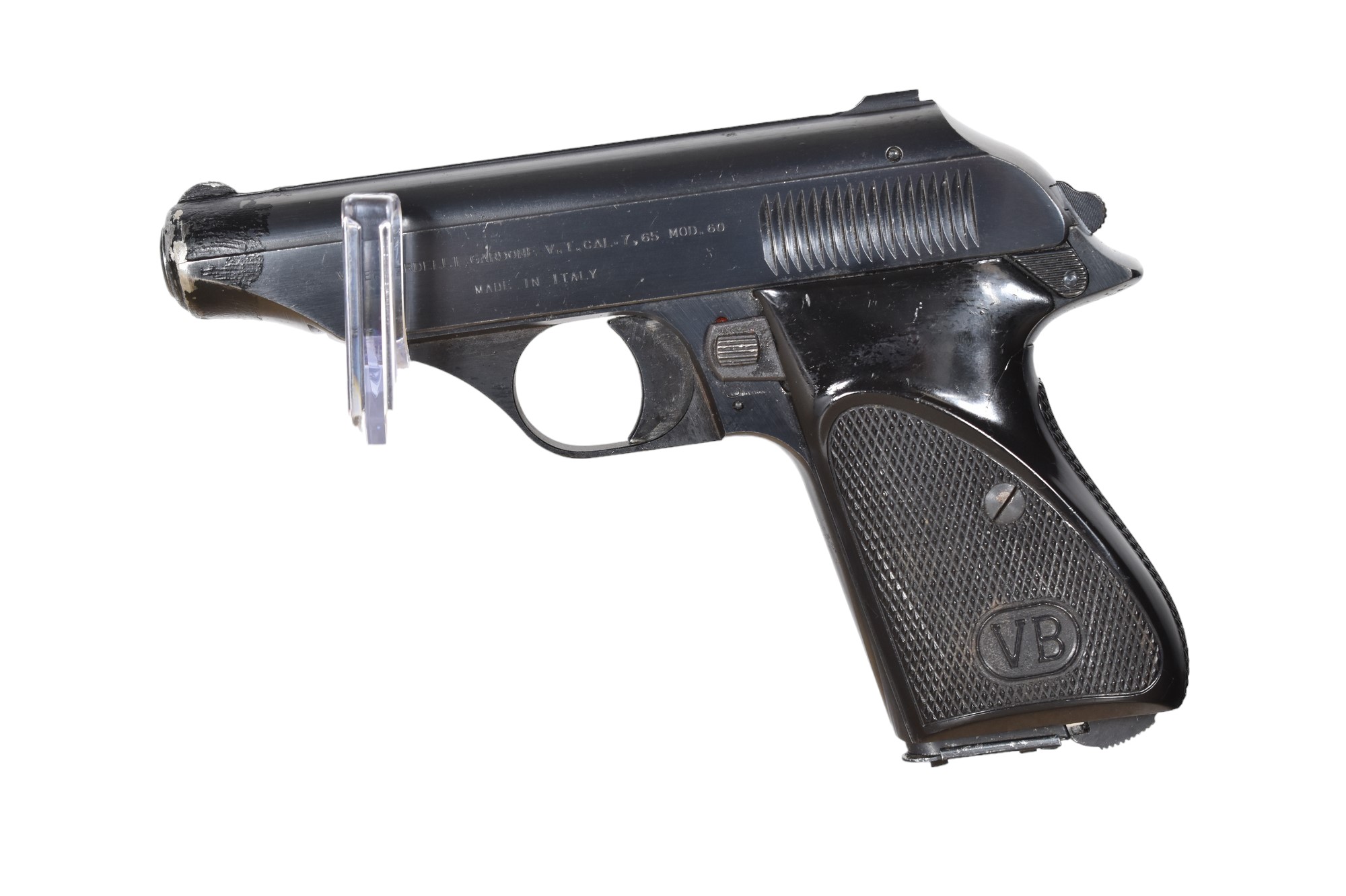 Diese Bernadelli Pistole Modell 60 im Kaliber 7,65 mm Browning hat eine Gesamtlänge von 17 cm und eine Lauflänge von 9 cm. Das Gewicht beträgt 0,67 kg. Es handelt sich um eine nummerngleiche Vollmetallwaffe mit Kunststoffgriffschalen. Die Visierung besteht aus fester Kimme und festem Korn, beide sind nicht verstellbar. Ein Magazin ist vorhanden, weist jedoch leichte Beschädigungen auf.