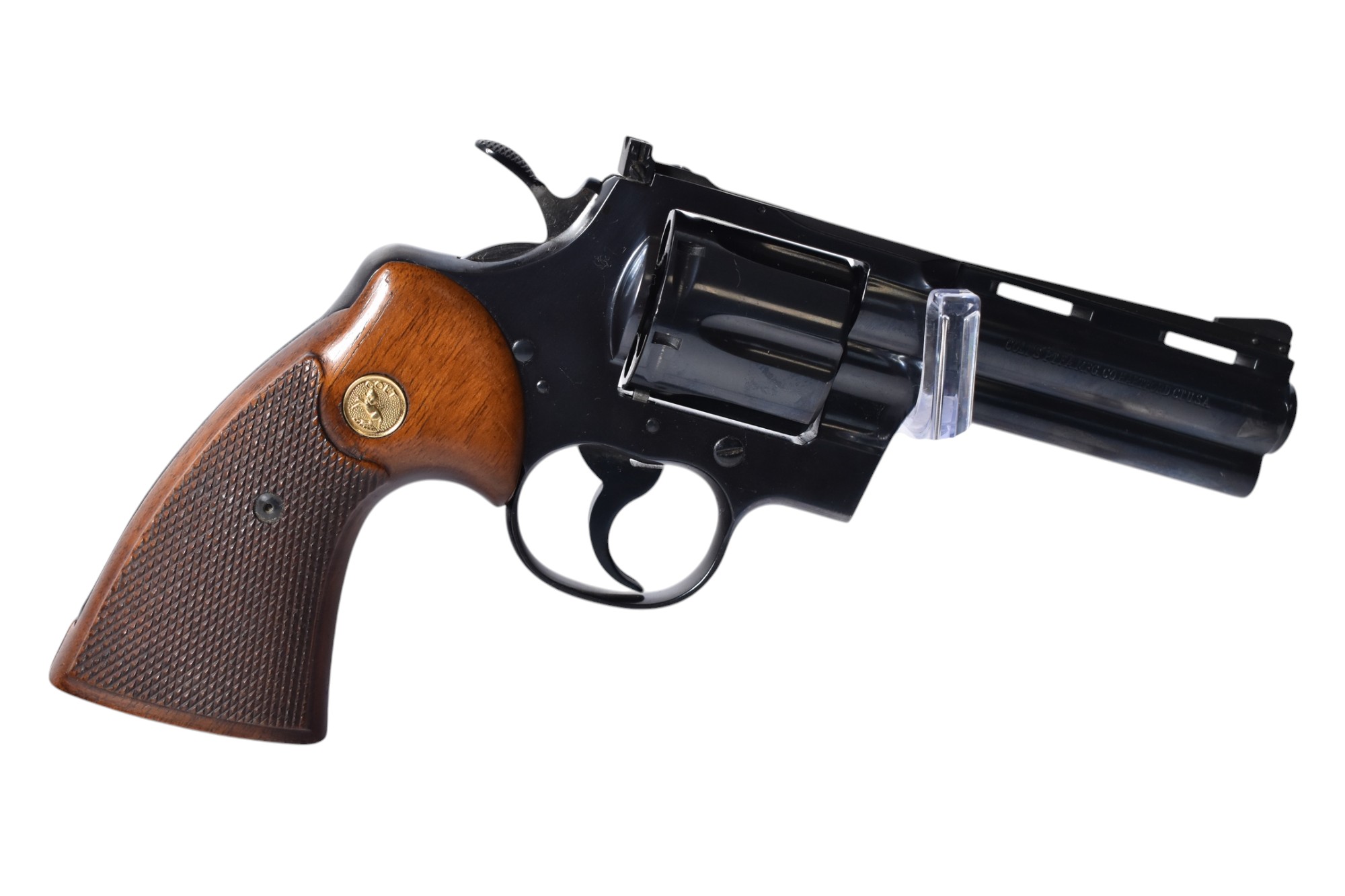 Dieser Colt Python Revolver im Kaliber .357 Magnum verfügt über einen 4-Zoll-Lauf und ein Trommelmagazin mit einer Kapazität von 6 Schuss. Der Revolver befindet sich in einem Zustand der Bewertung 2, was auf normale Gebrauchsspuren hinweist. Das Timing ist bei 5 von 6 Trommelkammern in Ordnung, was beachtet werden sollte. Er ist mit klassischen Holzgriffschalen ausgestattet und verfügt über einen gültigen Beschuss aus dem Jahr 1967.