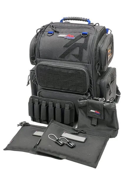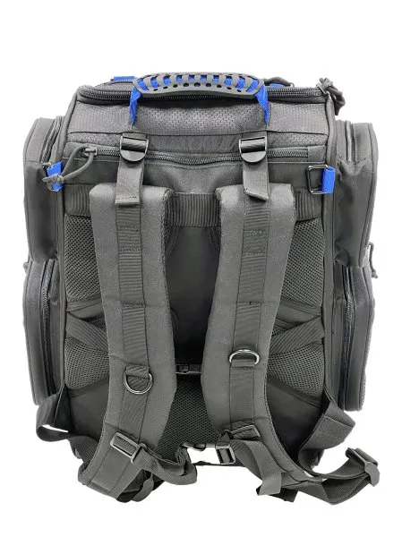Das obere Fach bietet großzügigen Stauraum, während das untere Fach für Munition und bis zu zwei Pistolen ausgelegt ist. Für noch mehr Platz kann die harte Innenschale im unteren Bereich entfernt werden. Außen verfügt der Rucksack über große Taschen für Zubehör und eine Klettfläche auf der Vorderseite für die Anbringung zusätzlicher Molle-Taschen. Das blaue Innenfutter sorgt für eine klare Sichtbarkeit aller Inhalte, selbst bei schlechten Lichtverhältnissen.