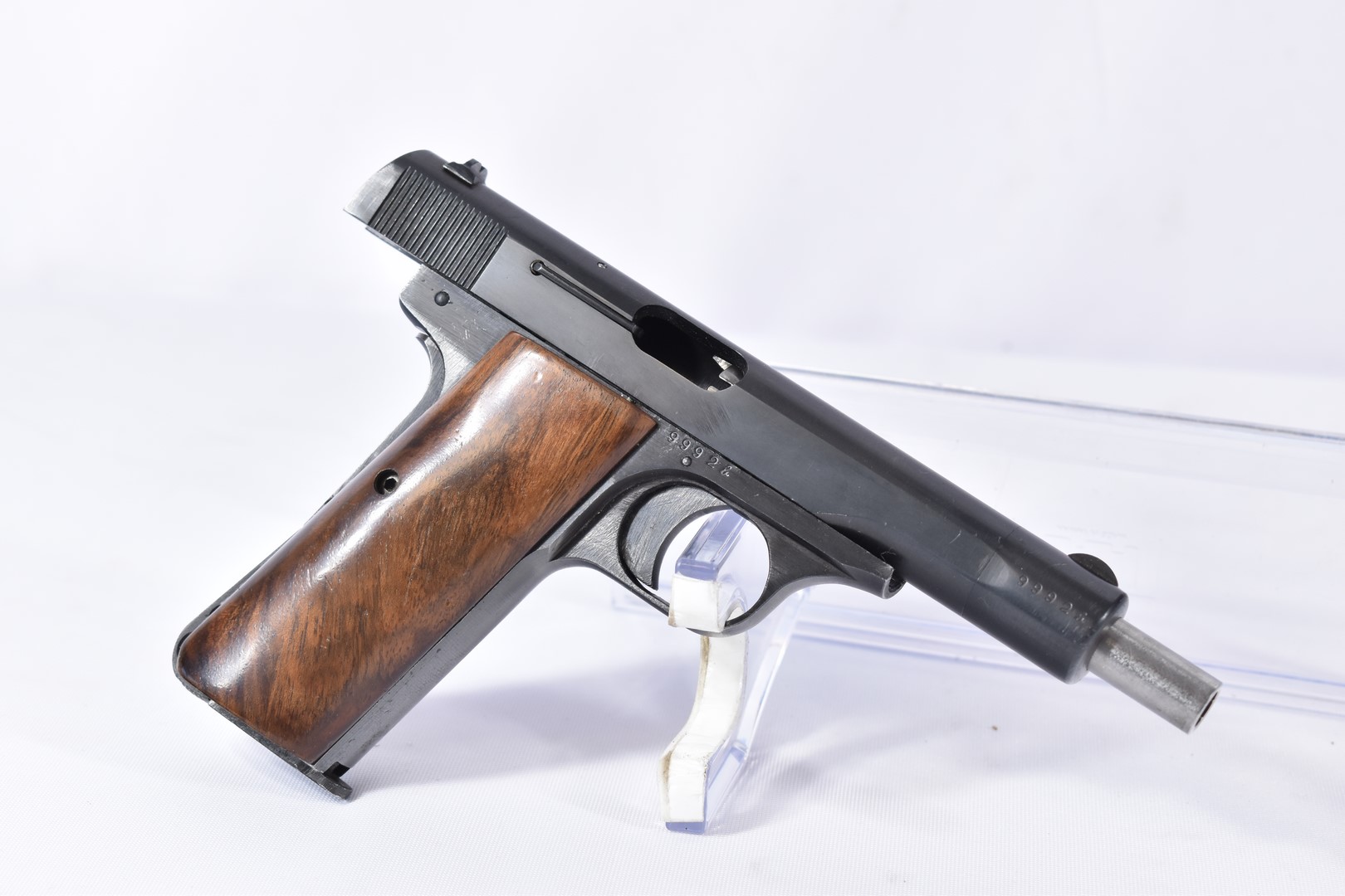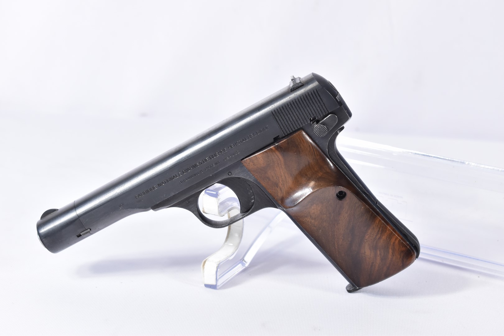 Diese FN Pistole im Kaliber 7,65mm Browning hat eine Gesamtlänge von 18 cm und eine Lauflänge von 11,5 cm. Sie wiegt 670 g und befindet sich im Zustand 3, was normale Gebrauchsspuren bedeutet. Die Pistole ist mit Holzgriffschalen ausgestattet und verfügt über einen gültigen Nitrobeschuss.