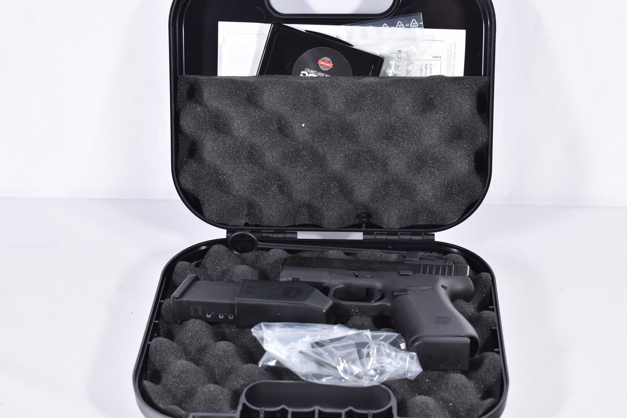 | Besonderheiten | Glock Pistolenkoffer, Ersatzmagazin, Griffschalen, Ladehilfe, Bedienungsanleitung |