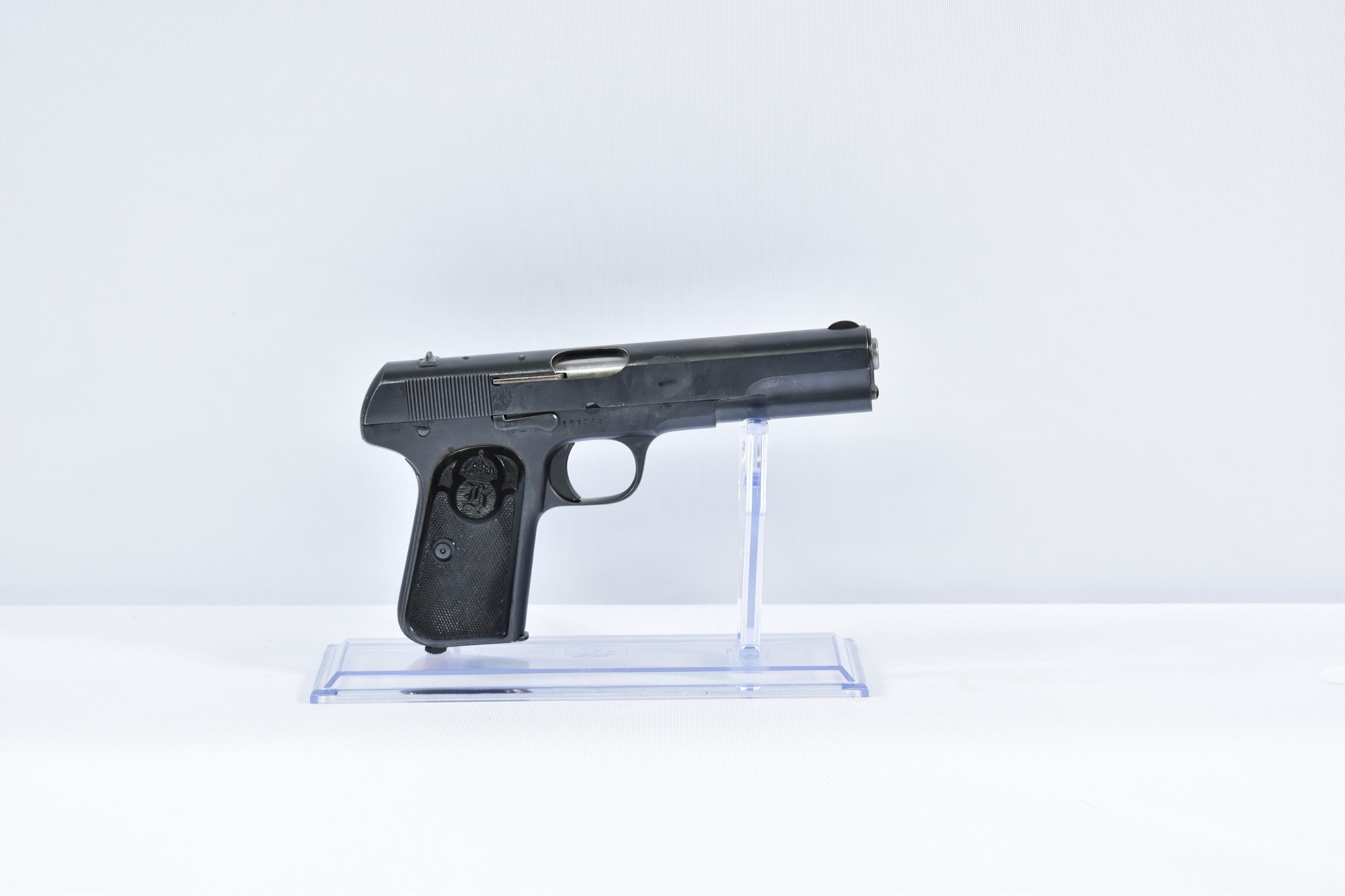 Diese Husqvarna Pistole im Kaliber 9mm Browning Long hat eine Gesamtlänge von 20,5 cm und eine Lauflänge von 12,7 cm. Sie wiegt 0,89 kg und befindet sich im Zustand 1, was bedeutet, dass sie wie neu ist. Die halbautomatische Pistole hat keine gültigen Beschuss und ist als Husqvarna Modell 1907 beschriftet.
