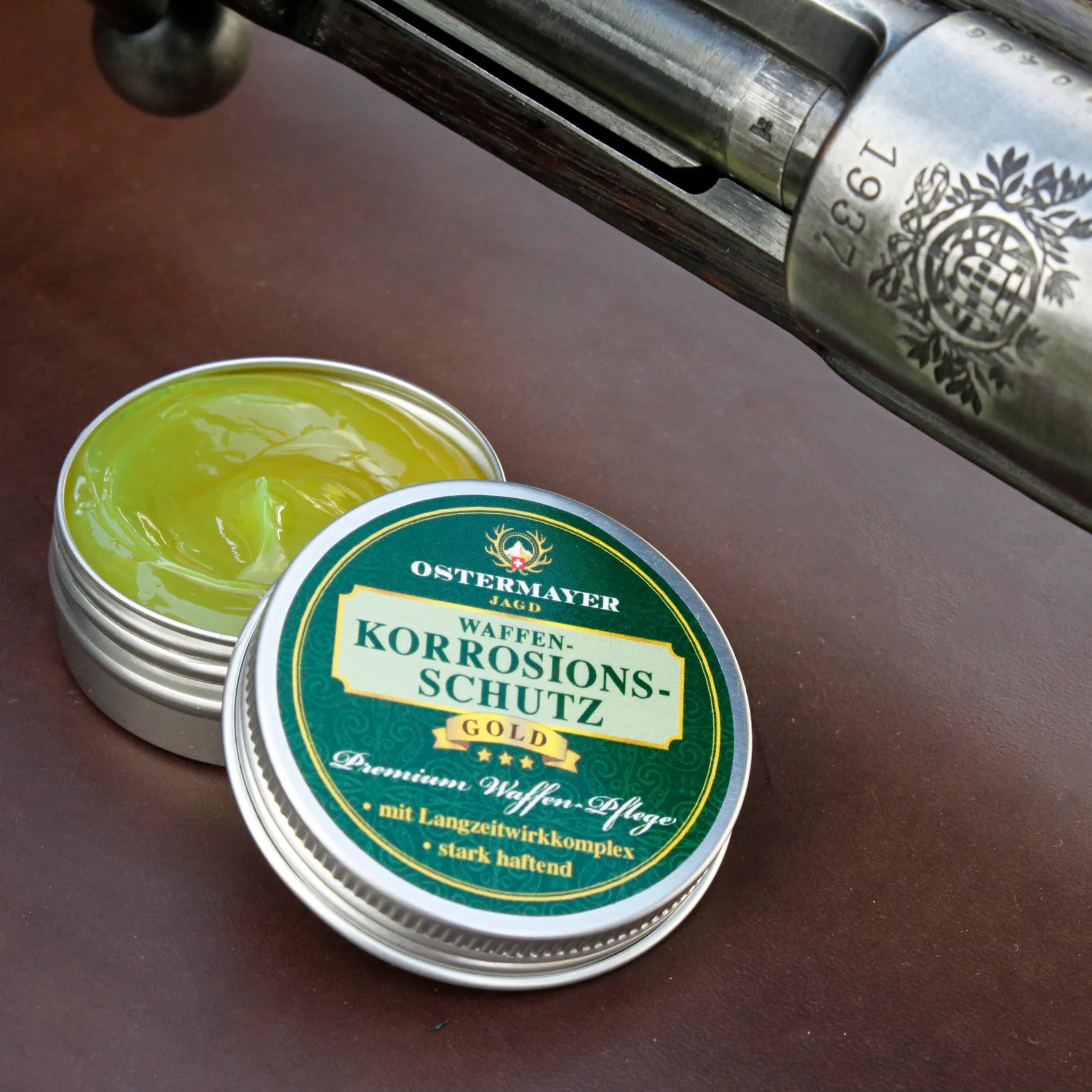 Der Ostermayer Jagd Waffen Korrosionsschutz GOLD 30g ist extrem ergiebig und wird Ihnen somit lange Freude bereiten. Das Mittel nimmt Schmauch und Salzrückstände auf und verkapselt diese, damit kein Rost entstehen kann. Es haftet dort, wo Sie es anbringen und führt somit nicht mehr zu verkleben oder verharzen des Abzuges oder des Verschlusses.