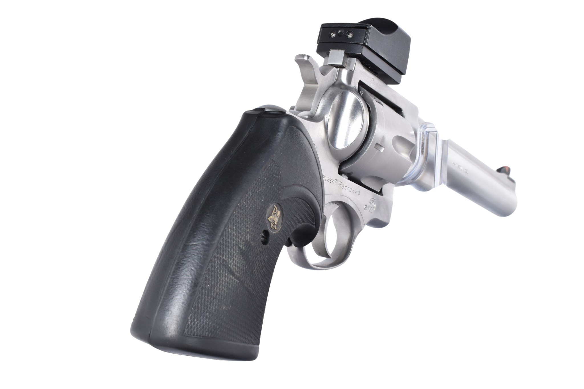 Diese Ruger Redhawk im Kaliber .44 Remington Magnum ist mit einem montierten Docter-Rotpunktvisier ausgestattet und hat eine Lauflänge von 18,5 cm. Der Zustand wurde mit 2 angegeben, was auf normale Gebrauchsspuren hinweist. Es können leichte bis mittelstarke Dellen sowie Kratzer an der Brünierung vorhanden sein, die Schussbelastung ist als normal einzustufen. Diese Bewertung stellt lediglich eine allgemeine Einschätzung dar – nicht jeder Mangel oder Abnutzung muss exakt so vorhanden sein.