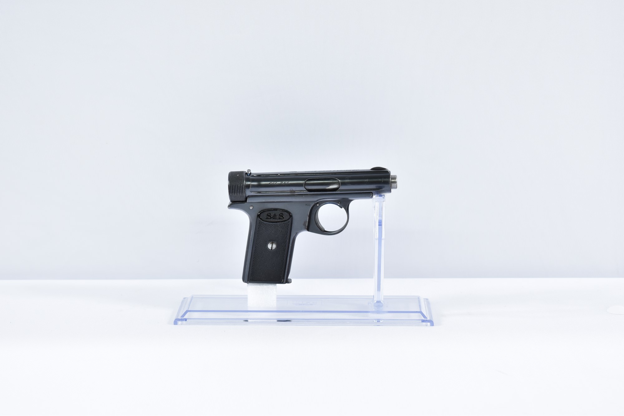 Diese Sauer & Sohn 1914 Pistole im Kaliber 7,65mm Browning hat eine Gesamtlänge von 14,5 cm und eine Lauflänge von 8 cm. Die Griffschalen sind aus Kunststoff gefertigt und weisen eine kleine Abplatzung an der linken Griffschale auf. Der Zustand der Pistole wird als 2 bewertet, was normale Gebrauchsspuren und leichte bis mittelstarke Dellen oder leichte Kratzer an der Brünierung bedeutet.