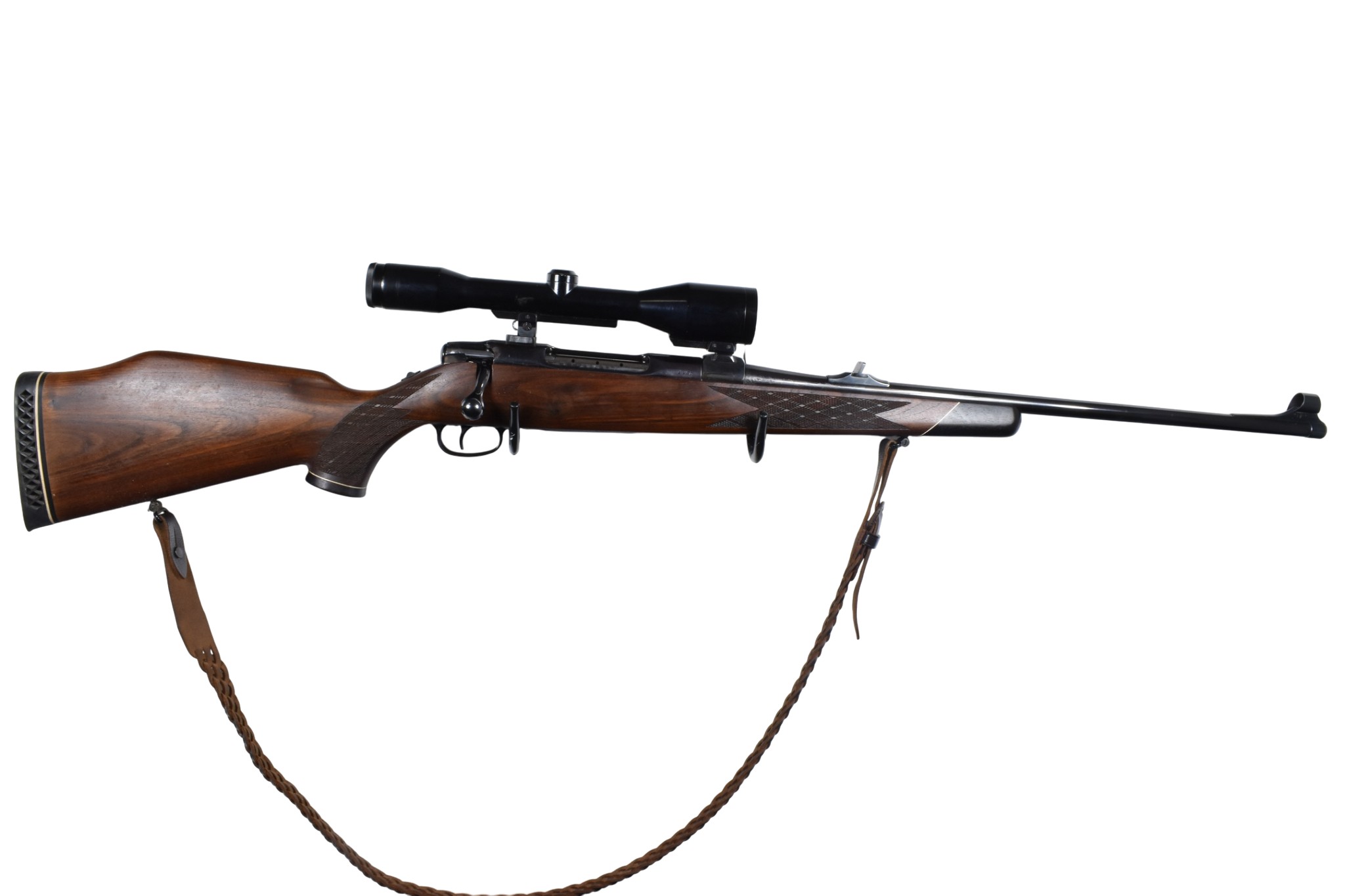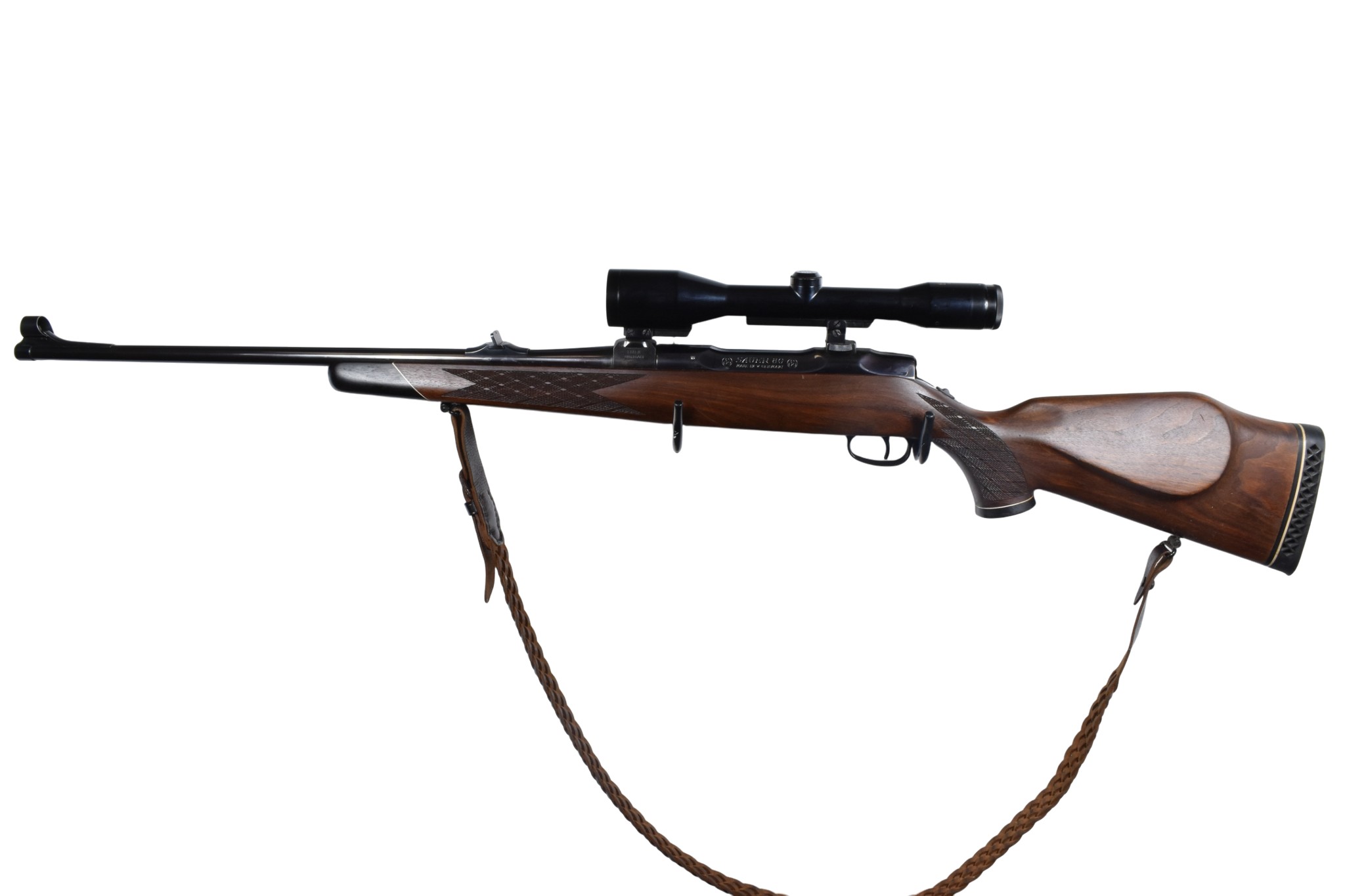 Diese Sauer 80 im Kaliber 7×64 ist mit einem Zeiss Diatal 6×42 Zielfernrohr ausgestattet, das über ein Absehen 1 verfügt. Die Optik ist mittels Suhler Einhakmontage befestigt, was eine präzise und wiederholgenaue Befestigung erlaubt. Ein Trageriemen ist vorhanden. Der Schaft ist mit einer Gummischaftkappe versehen.