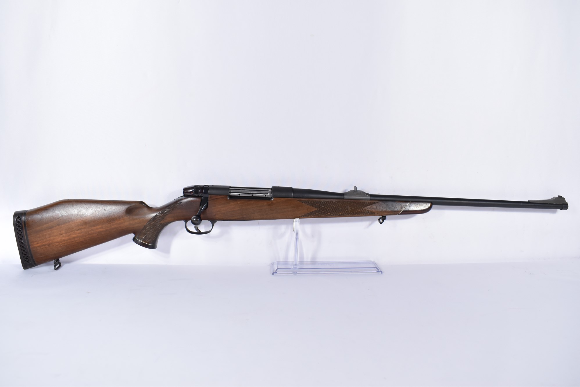 Die Sauer Weatherby Mark V 7×64 Repetierbüchse hat eine Gesamtlänge von 113 cm und eine Lauflänge von 60 cm. Die Schaftlänge beträgt 35 cm und das Gewicht 3,5 kg. Der Zustand der Waffe ist 2-3, was normale bis mittelstarke Gebrauchsspuren bedeutet. Der Schaft besteht aus Holz mit Abschluss. Sie hat eine Magazinkapazität von 5 und verfügt über zwei Riemenbügel. Ein gültiger Beschuss ist unten am System vorhanden.
