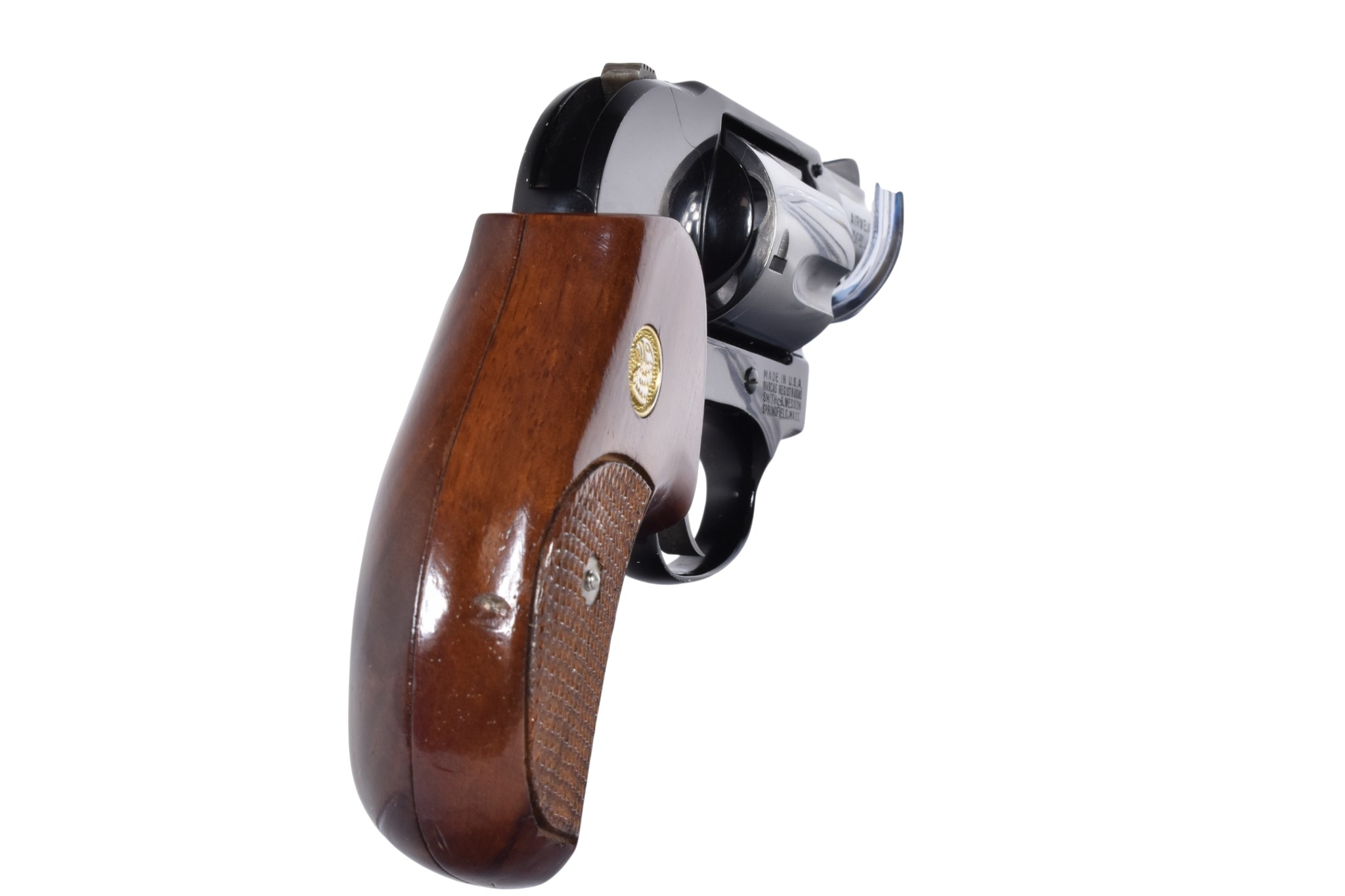 Dieser Smith & Wesson Revolver im Kaliber .38 Special verfügt über eine Lauflänge von 4,5 cm und ist mit klassischen Holzgriffschalen ausgestattet. Zum Lieferumfang gehört ein passendes Lederholster. Der Zustand wurde mit 2-3 angegeben, was auf normale Gebrauchsspuren hinweist. Es können mittelstarke Dellen an den Griffschalen sowie leichte Kratzer an der Brünierung vorhanden sein. Die Schussbelastung ist als normal einzustufen. Diese Zustandseinschätzung dient als generelle Orientierung nicht jeder Schaden oder Nutzungsspuren müssen exakt wie beschrieben auftreten.