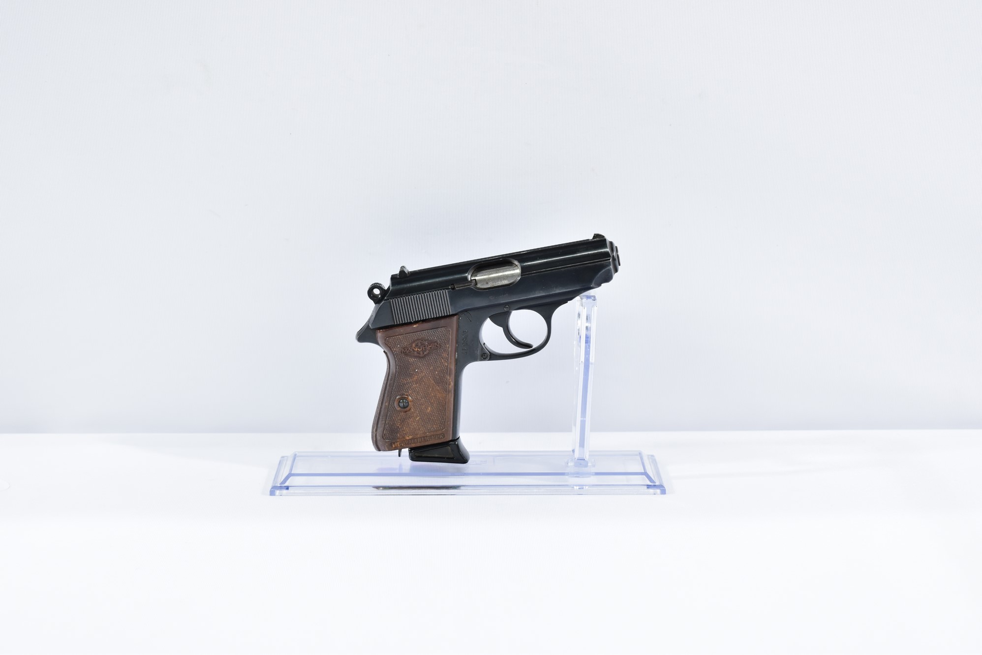 Diese Walther PPK Pistole im Kaliber 7,65mm Browning hat eine Gesamtlänge von 16 cm und eine Lauflänge von 5,5 cm. Die Griffschalen sind aus Kunststoff gefertigt. Der Zustand der Pistole wird als 3 bewertet, was starke Dellen oder starke Kratzer an der Brünierung bedeutet. Die Pistole wurde von Manurhin in Frankreich produziert und ist nummerngleich.